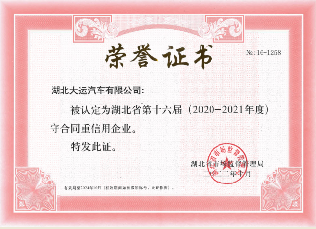 近日,湖北大运汽车有限公司被湖北省市场质量监督局评定为湖北省第十六届(2020-2021年度)“守合同重信用企业”。