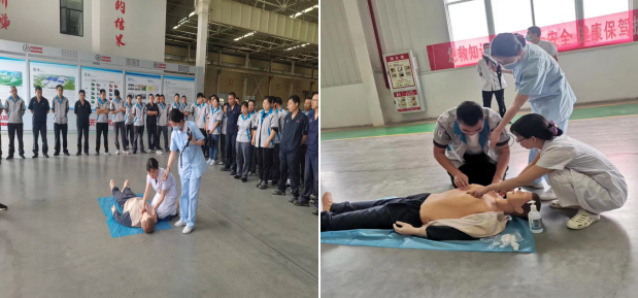 活动中,茶店卫生院医生向公司员工讲解了心肺复苏、海姆立克急救法、手部卫生宣教、简单的外伤包扎、固定、转运等急救知识与操作技能,通过“模拟人”现场演示相关的步骤,并邀请员工上台操作演示,让公司员工学习和掌握了急救知识和技能。