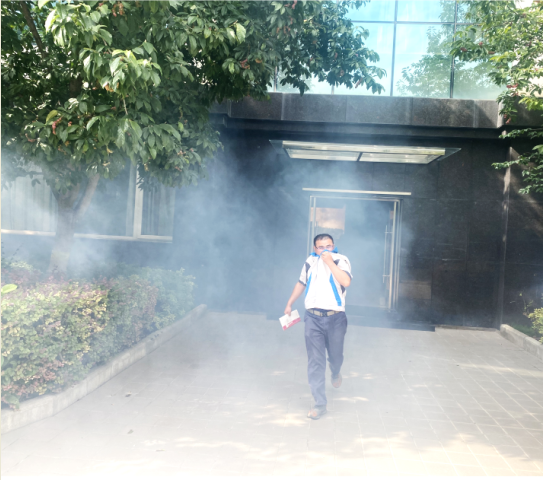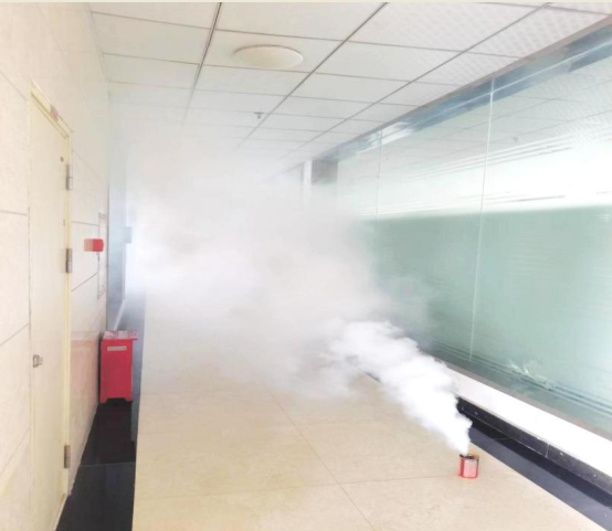 为了使演练更具真实性,本次演练在1楼、3楼使用了烟雾弹进行模拟火情,烟雾弹释放出大量烟雾。