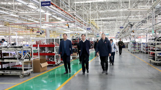 省经信厅党组成员、总工程师盛章学(左二)在总装车间调研