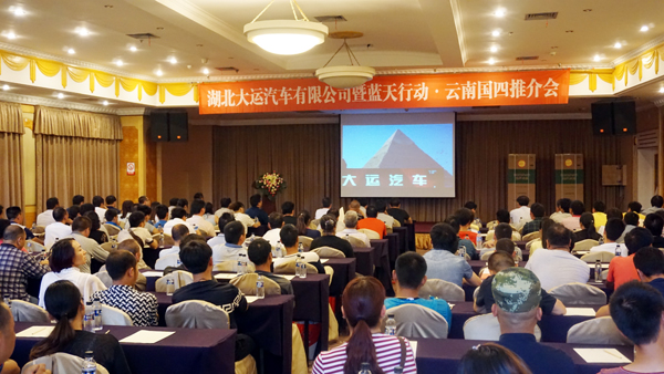 2015年6月18日下午,湖北大运2015“蓝天行动”暨“国四金品”推介会在昆明云安会都酒店多功能会议室盛大举行。湖北大运销售副总陈永生和公司销售、售后工作人员、供应商代表、云南省经销商代表、服务站和中心库负责人以及新老用户等共计200余人齐聚一堂,通过观看视频、产品讲解等方式,共同分享了大运汽车质量过硬、性价比高、性能优越的产品特色,并共同见证了湖北大运“蓝天行动”的巨大政策优惠。