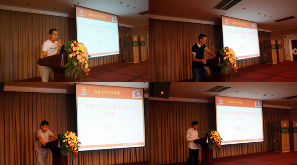 接下来,云南省灿捷汽车销售有限公司总经理单建明先生、云南省奕都汽车销售有限公司总经理周军先生、云南省昌哲汽车销售有限公司总经理祝宏先生、云南久力服务有限公司吴勇先生、云南东欣机电贸易有限公司总经理胡庭明先生等经销商代表也纷纷发言,畅谈了与湖北大运合作以来建立的坚实信任感,并表达出对湖北大运服务越来越完善、产品越来越丰富的极大信心。