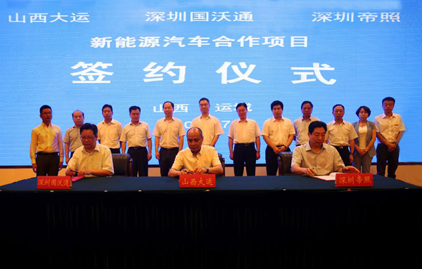 12时,签约仪式正式开始,在现场人员的共同见证下,山西大运汽车制造有限公司总经理陈澔利、深圳市国沃通新能源物流有限公司董事长李瑶、深圳市帝照投资有限公司董事长杨福顺代表各自公司在协议书上签字,并互换协议,整个仪式在喜庆祥和、令人振奋的气氛中圆满结束。