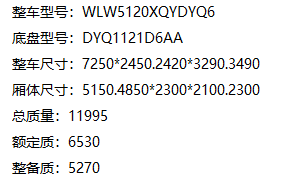 主要配置:大运危化底盘,单排2088mm驾驶室,新款豪华内饰,玉柴165马力国六发动机,陕齿小八档,2.5T/6T,232mm车架,245/70R19.5 16PR真空胎带方向助力,原厂空调,中控锁,电动玻璃,遥控锁,多功能方向盘,断气刹,带定速巡航,已安装防爆胎、刹车片报警,带双预警。