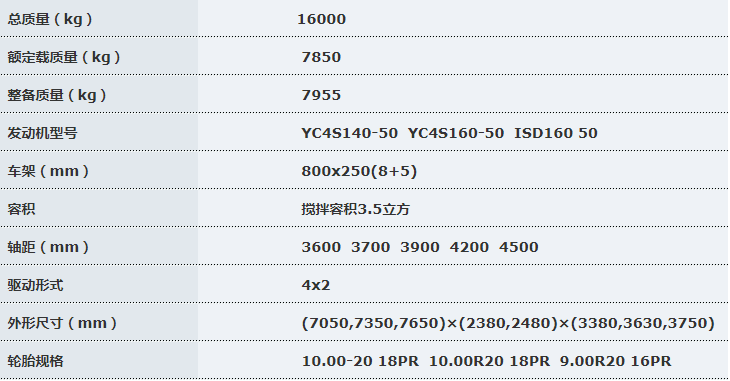 车型特点 1.豪华宽体车身。车身宽度1880mm,增加导流槽等低风阻设计更加省油。 2.高承载力。采用3.6T前桥,10T后桥,大大提高承载力;一次合压成型大梁,经久耐用,重压不变形。 3.制造精良。搅拌筒大容积设计,具有较大的装料空间和搅拌空间;搅拌筒采用集成自动焊(有效保证焊接质量)及喷丸、防锈处理、烤漆工艺,有效地延长使用寿命;搅拌筒采用大型车床加工(保证其同心度,使进出料均匀即剩余率1%);重心较低,整车在行驶时具有更高的稳定性。