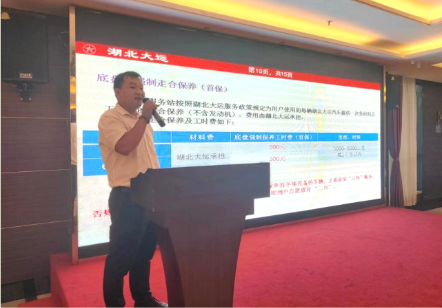 湖北大运汽车有限公司售后服务部主管喻维东向在座来宾详细介绍了“大运服务、领先一步”的服务理念,并讲解了湖北大运在全国的服务网络、配件保障和服务政策,力争用质量赢市场,以服务得人心,用心为每一位用户保驾护航。