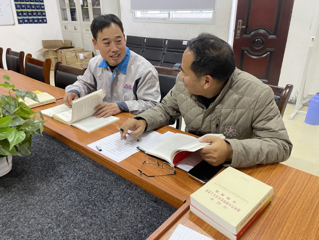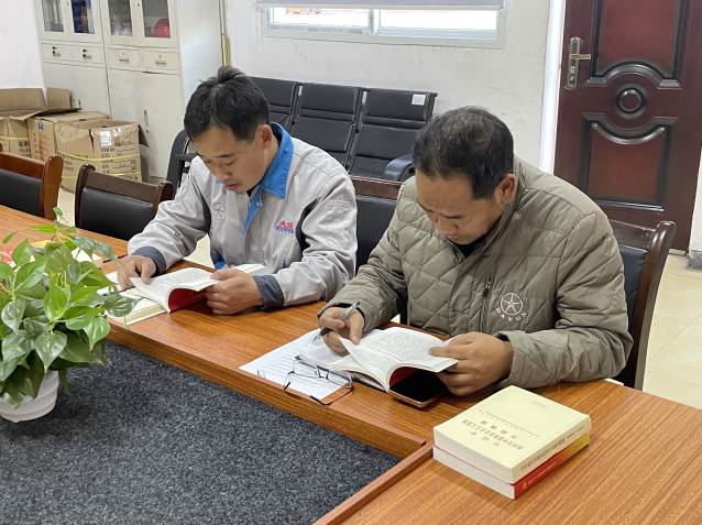 技术总师曹纯儒首先与改装部工段长王震共同学习了《习近平新时代中国特色社会主义思想专题摘编》、《二十大党章修正案学习问答》、《党的二十大报告-学习辅导百问》部分节选章节。学习过程中王震同志根据学习内容分享了自己的学习感悟。