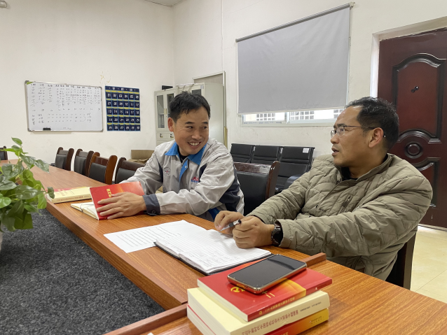 在王震分享结束后,曹总与王震同志进行了交流,询问在学习中是否有困难,王震同志讲到在主题教育学习中,部分名词难以理解,学起来比较吃力。技术总师曹纯儒针对王震在学习过程中不懂的地方一一进行了解读,并建议王震要积极参加生产党支部的主题教育学习活动,多学多问多请教,同时也欢迎王震参加技术质量党支部的主题教育学习,互相学习进步。