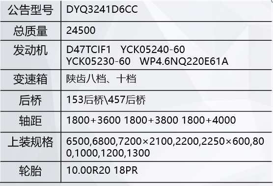 采用国内一线品牌潍柴、玉柴、云内国六排放发动机,整车传动系精致匹配,节油设计,动态响应快