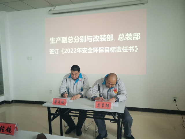 会议开始,首先由生产管理部安技环保科主管邱耕对2021年度安全环保工作进行汇报并重点对2022年度安全工作做出了规划。汇报结束后由生产副总蒋总分别与2022年安全指标代表部门改装部和总装部签订了“2022年安全环保目标责任书”。