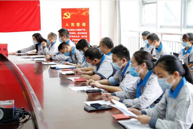 在新党员宣誓环节,公司行政党支部书记雷晓芳同志宣读了新党员名单,公司生产党支部书记胡丹丹为新发展预备党员王虎佩戴了党徽。随后,新发展的预备党员王虎在鲜艳的党旗下庄严地举起了右拳,在领誓人的领誓下,向党庄严宣誓,用铿锵的誓言表达了对中国共产党的忠诚和为共产主义事业奋斗终身的坚定信念。王虎在纳新党员代表发言中表示:我将会以党员的标准严格要求自己,立足本职、无私奉献,自觉用党的理论知识武装头脑,提升自身综合素质,以身作则,时时处处发挥好党员模范带头作用,在思想上、行动上始终同党组织保持高度一致,做一名思想坚定、作风过硬、工作积极的党员,为公司发展做出自己的贡献。