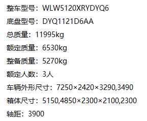 【底盘配置】 大运危化底盘,单排2088mm驾驶室,新款豪华内饰,玉柴165马力国六发动机,陕齿小八档,2.5T/6T,232mm车架,245/70R19.5 16PR真空胎带方向助力,原厂空?调,中控锁,电动玻璃,遥控锁,多功能方向盘,断气刹,带定速巡航,已安装防爆胎、刹车片报警。